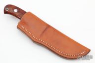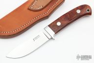 This Skinner by John Young features a mirror polished blade with .162" blade stock and 1.019" blade depth, full tapered tang construction. The handle has a mirror polished stainless guard, amboyna burl wood scales and red liners. Lanyard hole at butt. Comes with brown leather sheath. Excellent condition.