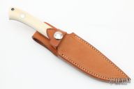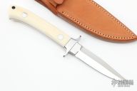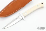 This Herron Style Small Fighter by John Young features a mirror finished double-edged blade, .148" blade stock and .760" blade depth, full tapered tang construction. The handle has mirror polished stainless steel guard, walrus ivory scales with red liners. Comes with a brown leather sheath. Excellent condition.