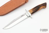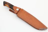 This Model 17 Fighter by John Young features a mirror polished blade with a sharpened top edge, .247" blade stock and 1.111" blade depth, full tapered tang construction. The handle has mirror polished double guard, amber stag scales with red liners, lanyard hole at the butt. Comes with brown leather sheath. Excellent condition.