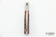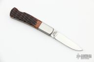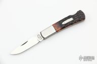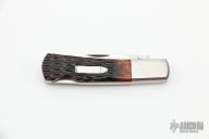 This knife features a mirror polished drop point blade with a single nail nick. The handle has stainless bolsters, jigged bone covers, nickel silver liners. Includes original box. Excellent Condition.