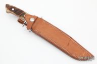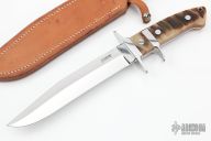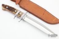This Sub-Hilt Fighter by John Young features a mirror polished blade with a sharpened top edge, .249" blade stock and 1.217" blade depth, full tapered tang construction. The handle has mirror polished double guard and sub-hilt, sheep horn scales with red liners, lanyard hole at the butt. Comes with brown leather sheath. Excellent condition.