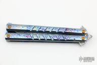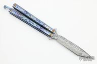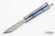 This B2 Balisong by Sergey Rogovets features a Nichols XHP Core Damascus tanto blade. The handle has Black Timascus handles with bronzed hardware. Runs on ceramic trust bearings. Comes with the original soft pouch. Excellent condition.