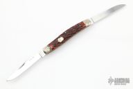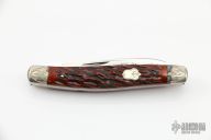 This CM-16 Hawbaker Muskrat pattern slipjoint from Cattaragus Knives features two polished blades with nail nicks. The handle has nickel silver double bolsters and escutcheon and jigged bone covers over brass liners and stainless steel backsprings.  Includes original box.  Excellent Condition.