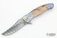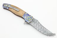 This LL-XX Framelock Flipper by George Muller features a Damascus clip point blade with a flipper. The handle has an anodized titanium frame with DarkTi dovetail bolsters front and rear, two piece titianum pivot collars, yellow liners underneath the mammoth scales, Damascus tip up clip and backspacer, anodized titanium hardware, filework along the spine.  Comes with a zippered case. Features IKBS, nice detent, lockup, action and blade seating. Excellent condition.
