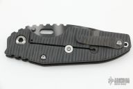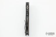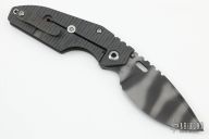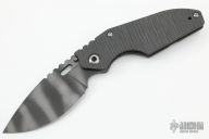 This XL Jibble by Mick Strider features a tiger striped blade with notched thumbrest and a thumbhole. The handle has a flamed titanium frame with tip up reversible clip. Nice detent, lockup and blade seating. New from the 2022 CCKS.
