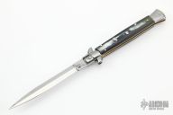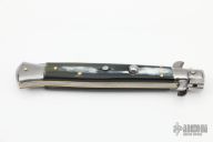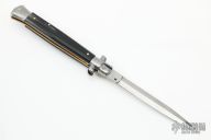 This 9" Picklock by Frank Beltrame features a polished dagger ground blade with false top edge. The handle has stainless steel bolsters, front and rear, buffalo horn scales, brass liners, stainless spring. Excellent condition.