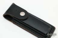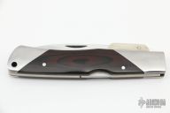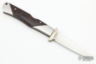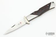 This Gameskeeper Swing Guard Lockback from Al Mar Knives features a drop point satin finish blade with nail nick. The handle is comprised of a nickel silver swing guard, stainless steel double bolsters and wood scales over brass liners and stainless steel lock bar. Lanyard hole with leather lanyard in pommel. Includes leather sheath with belt loop. Has a few marks on handle, and some patina on the silver but otherwise great condition.