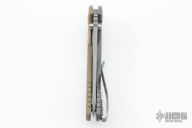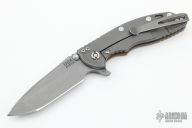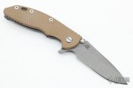 This 3.5" Spanto ground XM-18 from Rick Hinderer features a working finished blade with notched thumbrest and flipper. Brown G-10 scale and titanium frame and pocket clip. Dual thumb studs and notched thumb rest. Reversible pocket clip. Strong lock up, nice detent and blade seating is center.  Blade Steel: S45VN. The blade shows light signs of use otherwise the knife is in excellent condition.