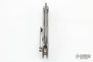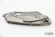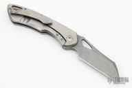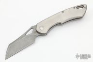 This Whippersnapper from Olamic Cutlery features a stonewash finished blade, thumbhole, notched thumbrest and front flipper. The titanium frame has an orange peel finish, matching pocket clip is positioned for tip up carry, and titanium standoffs. Blade is centered when closed and locks up with no play. Comes with maker's card with a serial number of WS118-W and dated 01/13/2020. Includes a padded zippered case. Excellent Condition.