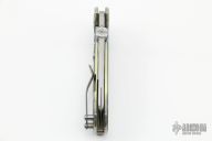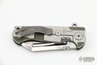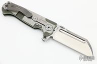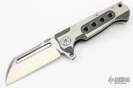 This ADV Mini-Butcher framelock flipper has a satin finished blade with notched flipper and thumbrest. Handle has a two-tone finished titanium frame with anodized edges, titanium backspacer with a tip up clip. Has stainless steel lockbar insert and lockbar stabilizer. Nice smooth action, detent, lockup and blade seating. Dated 2015. Excellent condition. Comes with a zippered case.