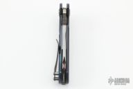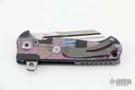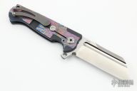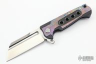 This ADV Mini-Butcher framelock flipper has a satin finished blade with notched flipper and thumbrest. Handle has an anodized titanium frame with titanium backspacer with a tip up clip. Has stainless steel lockbar insert and lockbar stabilizer. Nice smooth action, detent, lockup and blade seating. Dated 2015. Excellent condition. Comes with a zippered case.