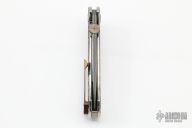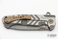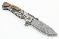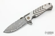 This ADV Trailboss framelock flipper has a San Mai Damascus drop point blade with notched flipper and thumbdisc and thumbrest. Handle has a satin and bead blast finished titanium frame and tip up clip, tumble finished titanium backspacer. Frame has V-milling for added grip and visual appeal. Has stainless steel lockbar insert and lockbar stabilizer. Nice smooth action, detent, lockup and blade seating. Comes with a nylon zippered case. Excellent condition.