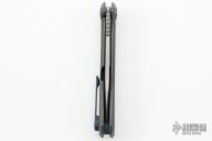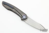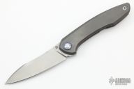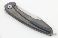 This Russkiy from Alexander Cheburkov features a matte finished blade with swedge, notched thumb rest and flipper. The handle has a tumbled titanium frame with an anodized titanium backspacer, pivot collars and tip up clip with hidden screws. Includes original box and papers. Rides on bearings, nice detent, lockup and blade seating. Has stainless lock insert. Lanyard pin at the butt. Excellent condition.