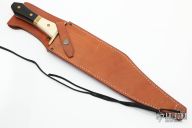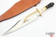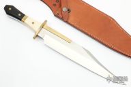 This Presentation Bowie by Al Mar was made for the Japanese market only, it features a satin finished clip point blade with false top edge and brass parry guard, .295" blade stock and 2.115" blade depth, full tang construction. The handle has a brass guard, ivory and black paper micarta scales with brass spacer. Comes with original brown leather sheath. Has a couple light scratches, otherwise excellent condition.