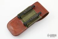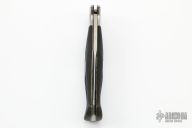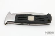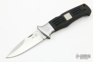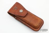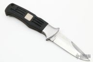 This AL MAR SERE Tactical Folding Knife features a satin finished spear point blade with a nail nick. The handle has stainless steel bolsters, textured black rubber with the Al Mar Chop inlaid on both sides, brass liners, stainless steel spring and backspacer, lanyard hole. Comes with original brown leather sheath. Has scratches, has been resharpened, otherwise good condition.