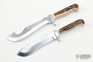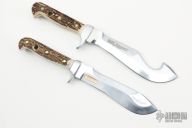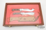 This Vintage White Hunter and Cougar by Puma is the ultimate outdoorsman’s knife pair, originally designed by African professional hunters. It features a curved blade for cutting, slicing and skinning and a strong back edge for hacking, the Cougar having a large gut hook. Handmade by skilled craftsmen with stag scales. Comes with an original brown leather sheath. Both knives come in a glass display case. Excellent condition. The White Hunter is #97674 and the Cougar is #56472