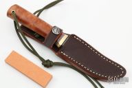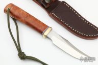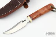 This knife has a satin finished blade with sharpened top edge, .171" blade stock and .931" blade depth, hidden tang construction. The handle has a brass hilt with red, white and blue spacers and a Thuya burl wood grip. Comes with a brown leather sheath and original paper wrapping. Excellent condition.