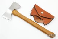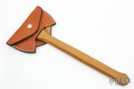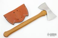 Very attractive belt axe with a hickory handle. Head is hand forged by traditional blacksmith methods. Satin finished double edged blade. Edges are 3" long. Comes with leather sheath with belt loop. One edge is for chopping and one edge for cutting. Has a few light scratches, otherwise excellent condition.