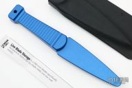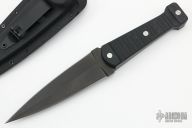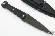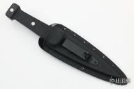 The most effective dagger blade shape has a slight wedge shape. It provides us with several advantages that the parallel dagger shape, common in mass production, does not. Parallel edges became the standard because knife makers and factories use flat bar stock which comes the width of the blade. Making it cheaper and easier for the maker. But the actual use of the blade should dictate the design, not ease of production. The Blade Nonparallel edges or a wedge shaped dagger creates a increasingly wider wound channel, increasing the users capability of hitting the vital target aimed at. It also becomes free from the friction of the wound channel much quicker, allowing the user to hit multiple targets more quickly. Perhaps the greatest benefit in the wedge shaped dagger is the amazingly effective point configuration. With the parallel dagger you end up with a rounded point design. As opposed to the Kryptos design, which gives us a truly remarkable design for thrusting through even the most resistant surfaces. (multiple folds of clothing, Kevlar, webbing types of vests, etc.) The Handle When it comes to blade handles there are a few considerations. Draw, Use, Durability and Comfort. The Kryptos has all four. In particular is it's draw. When it comes time, you want a 100% positive draw. No fumbling trying to find it or gain purchase of your master grip for the draw stroke. If you have gloves on that becomes even harder. To dramatically increase the positive draw stroke we created a four point friction area on the pommel, allowing the hand to catch the blade handle in any or all four sides. This unique design dramatically increases the user's grip and insures a positive master grip upon completion. The Trainer is an exact replica of the live blade but with a couple of small but important changes. The tip of the Kryptos Trainer is 0.5 inches shorter than the real blade. When you practice with a trainer, you touch your target with the tip but cannot enter the target. This shorter design builds an automatic half inch penetration into your targeting and negates the training scar created by using trainers. The anodized blue color is a safety standard in Military training. All inert training devices are blue. (blue guns, blue Claymores, etc.) **Due to the nature of the live blade and trainer feeling exactly the same: PRIOR TO TRAINING, ALWAYS VISUALLY ENSURE YOU HAVE THE TRAINER IN YOUR SHEATH AND YOUR LIVE WEAPON SAFELY SECURED. Kryptos Specs OAL - 9 3/4 inches Blade Width 1 1/2 inches Blade length 5 1/4 inches Blade thickness 5/32 of an inch Handle length 4 1/2 inches Handle Thickness 3/4 inch tapering to 1/4 inch AUS 8 Steel Blade coating - Titanium Nitride G 10 Handle Custom Kydex sheath. Excellent condition.