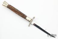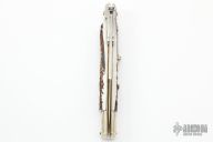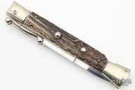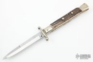 This 13" Swinguard Auto from A.G.A. Campolin has a polished stainless steel spear point blade with false top edge. Handle has stag scales with nickel silver bolsters and pommel, brass liners, brass pins, stainless steel back spacer, and a safety. Dated 2020, has some light scratches, otherwise excellent condition. Comes with a black leather slip sheath.