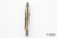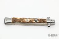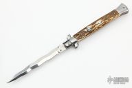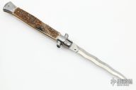 This 9" Picklock by Frank Beltrame features a polished Kris ground blade with false top edge. The handle has stainless steel bolsters, front and rear, stag scales, brass liners, stainless spring. HExcellent condition.