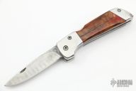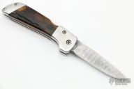 This lockback folder by Norman Levine features a Damascus blade, high polish bolsters front and rear, and a contoured mammoth scale handle. Comes with nylon belt sheath. Has scuffs and scratches on the handle. Knife has been resharpened. Good condition otherwise.