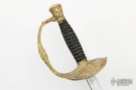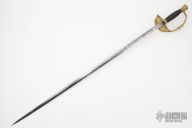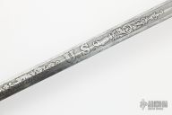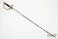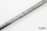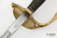 This Model 1860 by JM Litchfield features a spear point blade with unsharpened edges, etching on the blade on both sides, .172" blade stock and .735" blade depth, hidden tang construction. The handle hand an ornate brass D-guard, leather and twisted wire wrapped wooden grip. Has some scuffs/scratches/patina, otherwise good condition for its age.