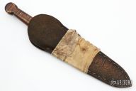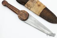 This Trade Dagger from J.P. Miller features a double edged blade with .163" blade stock and 2.326" blade, hidden/mortise tang construction. The handle has a a curly maple grip with mosaic pins and brass pins. Comes with a brown leather sheath with raw hide wrap. Excellent condition.