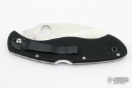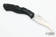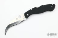 This Civilian Lockback Folder by Spyderco has a satin finished, fully serrated hawkbill blade with thumb hole. Handle is black G-10 with stainless steel backspacer/ lock, has a tip down clip. Excellent condition. Comes with a Spyderco zippered case.