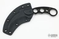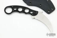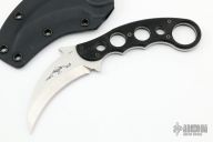 This karambit by Emerson Knives features black G-10 scales. Stonewashed chisel ground blade. Includes a black kydex sheath. The very tip is broken off, otherwise excellent condition. #0347 on blade and dated 2014.