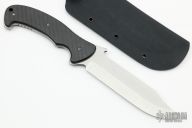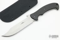 This Custom Bowie Fixed Blade by Ernie Emerson features hand ground by hand satin finished blade with a notched thumbrest, .142" blade stock and 1.218" blade depth, full tang construction. The handle has carbon fiber scales. Comes with kydex sheath. Excellent condition.