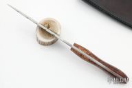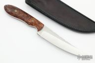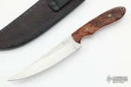 This hunter by Lynn Dawson features a satin finished blade with notched thumbrest and fileworked spine, .163" blade stock and 1.161" blade depth, full tang construction. The handle has burl wood scales with mosaic pins and lanyard hole. Comes with a black sheath. Comes with a zippered case. Excellent condition.