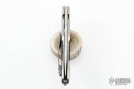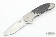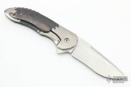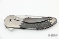 This Chain Gang by Daniel Galloway features a hand rubbed, satin finished blade with false top edge and flipper. The handle has an orange peel finished titanium frame with satin edges. Carbon fiber inlays. Pocket clip and backspacer are darkened/orange peeled zirconium. Nice detent, action, lockup and blade seating. Excellent condition.