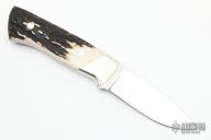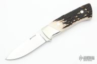 This knife by Buster Warenski features a mirror polished blade, nickel silver bolsters and stag scales, .166" blade stock, 1.066" blade depth, full tapered tang construction. Excellent condition.