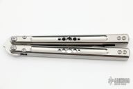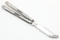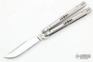 This Balisong by Palethius Designs features a satin finished blade. The handles are milled titanium with matching spacers. Comes with original box, black leather sheath and papers. Has a few light scuffs, otherwise excellent condition.