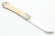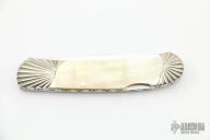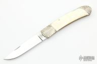 This Lockback by Ken Steigerwalt features a mirror polished blade with fileworked spine and nail nick. The handle has scalloped nickel silver bolsters, front and rear, gold lip pearl scales, fileworked nickel silver liners, fileworked stainless steel backspacer. Nice lockup and blade seating. Excellent condition.