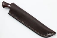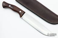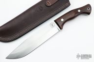 This Scout from Adventure Sworn features a hand rub satin finished saber ground blade with .160” blade stock and 1.735” blade depth, full tang construction. The handle has desert ironwood scales with black liners and stainless pins. Comes with a brown leather sheath. Excellent condition.