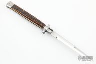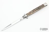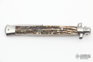 This swivel bolster auto by Italy features a polished blade with a false top edge. The handle has stainless steel bolsters and butt, stag scales and brass liners. Strong opening. Has safety. Has some scratches, otherwise good condition.