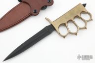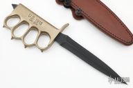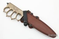 This MK1 Trench Knife by Les George features a black Cerakote double edged blade with .190" blade stock, .998" blade depth, hidden tang construction. The handle has a cast brass knuckle guard grip with a skull crusher. Comes with a brown leather scabbard by Chattanooga Leatherworks. Comes with a zippered case. Excellent condition.