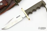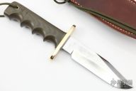This Model 15 Airman by Randall Made Knives features a clip point blade with a sharpened top edge, .217" stock. 1.279" blade depth, full tang construction. The handle has green linen micarta handle with finger grips and a brass guard. The Model 15 is designed especially for heavy-duty use and to be as nearly indestructible as possible. Comes with a brown leather sheath. Excellent condition. Comes with original paper wrapping.