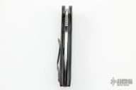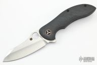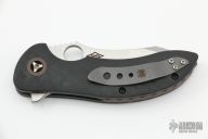 This Peter Carey designed Magnitude produced by Spyderco features a CPMS30V satin finished drop point blade with a swedge, notched thumbrest, flipper tab and deployment hole. The handle has carbon fiber scales over titanium liners. It has a brown G10 pivot collar, and "dragon spine" backspacer. Nice action, detent and blade seating.  Includes the original box and papers.  The box has been signed by Peter.  Excellent Condition.