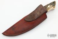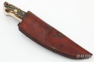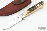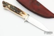 The 4" Utility by Bob Loveless features a mirror finished clip point blade with the "R.W. Loveless maker" Lawndale, California logo. Full tapered tang construction. .187" Blade Stock .964" Blade Depth. The handle has a nickel silver guard and stag scales with black liners, lanyard hole. #547. Comes with a Loveless brown leather sheath, this sheath has #876 on it and is in rough shape, fits nicesly. Has a couple of light scratches, otherwise excellent condition. Really nice stag on this one!