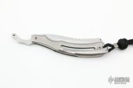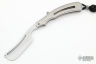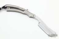 This Safadage Razor by Korth Cutlery features a stonewashed and chisel ground blade with a fuller. The handle has an orange peel finished titanium frame with matching backspacer and tip up clip. Comes with a nylon velcro case. New from maker.
