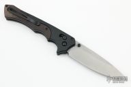This Rukus by Benchmade is a Niel Blackwood design. Axis lock mechanism. Matte finished plain edge blade with notched thumbrest and dual thumbstuds. The handle has black G-10 bolsters and brown canvas micarta scales, black stainless steel liners and tip up reversible clip. Comes with original box and papers. Excellent condition otherwise.