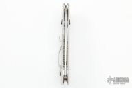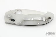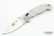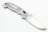 This Manix 2 by Spyderco has a satin finished drop point blade with thumbhole and notched thumbrest. Handle has glow in the dark scales over stainless steel liners, 2-way reversible tip up stainless steel clip, and lanyard tube pin. Has some scratches, otherwise good condition. Comes with original box and paperwork.