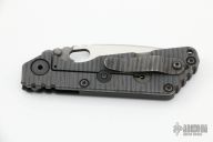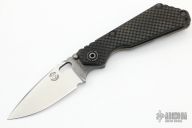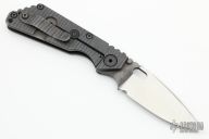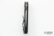 This SNG framelock folder by Mick Strider features a satin finished blade that has been reground by Tom Krein. The handle has a dimple pattern black G-10 and flamed titanium frame and tip up titanium clip. Includes a "Lock Bar Stabilizer" for maximum reverse lock retention. Nice detent, lockup and blade seating. Has a couple scratches/scuffs, otherwise good condition.