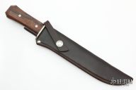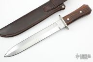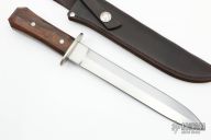 This long fighter by M Hasard features a hand rub satin finished double edged blade with .249" blade stock and 1.567" blade depth, hidden tang construction. The handle has a nickel silver guard, a cocobolo grip with stainless steel pins. Comes with a brown leather sheath. Has a few light scratches, otherwise excellent condition.