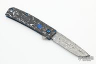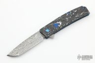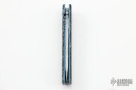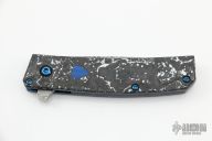 The Benchmade 601-211 Gold Class Tengu is a fully upscale version of the popular 601 flipper. This special edition knife features BiFrost Pattern Damasteel blade, white/black marbled carbon fiber scales, dual blue G-10 inlaid shields, sapphire blue PVD coated stainless steel liners and hardware, Raffir UV reactant SFX Blue Uranium with imbedded brass mesh backspacer. Comes with original box, leather sheath and COA dated Febuary-17-2021 and #979. Excellent condition.