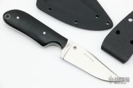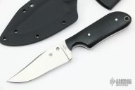 This Perrin inspired Street Beat by Spyderco has a satin finished VG-10 clip point blade with full tang and notched thumb rest. Blade stock is .154", depth is 1.087". Handle is black linen micarta with polished stainless steel pins and lanyard tube. Excellent condition. Comes with Kydex sheath and original box and papers.