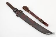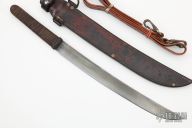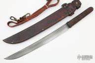 This Bush Wakizashi by Rick Marchand features a hand forged blade with .232" blade stock and 1.435" blade depth, hidden tang construction. The handle has a hemp wrapped handle. Comes with a custom brown leather sheath with shoulder rig. Excellent condition.